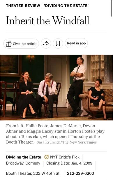 Hallie Foote, the playwright’s daughter, and James DeMarse, both first-rate. NY Times, Orphans' Home Cycle